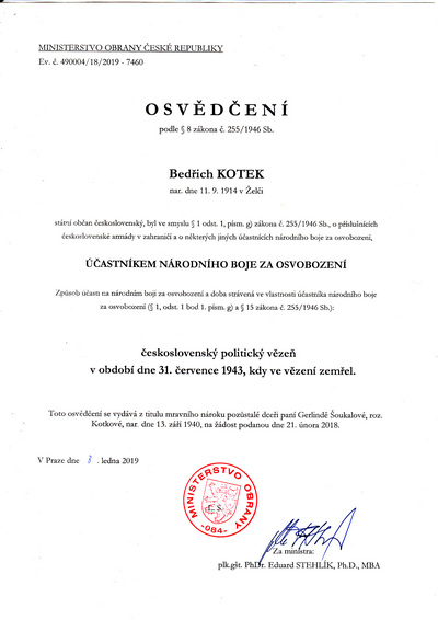 Osvědčení vydáné MO, na základě žádosti p. Gerlinde Šoukalové, dcery p. B. Kotka
